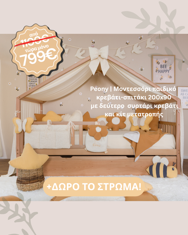 Peony | Μοντεσσόρι Παιδικό Κρεβάτι Σπιτάκι 200Χ90 από μασίφ ξύλο οξιάς με 2ο συρτάρι κρεβάτι & Κιτ μετατροπής| Δώρο Στρώμα Αφρού 200Χ90 | Δώρο Μπαλόνι Διακοσμητικό τοίχου με κεντημένο το όνομα του παιδιού